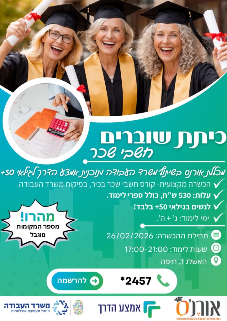 הגעת לגיל 50? בואי ללמוד קורס חשבי שכר בעלות 530 ₪ בלבד